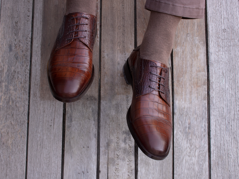 The Taj Derby Shoes, which combine both crocodile and iguana patterns in its spectacular design, are the perfect fit for those who like to stand out from the crowd. With subtle brogue details and flawless burnished tan and black color alternatives, they will perfectly complement both your formal and casual outfits.