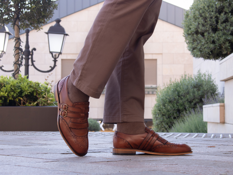 The Ara is a double monk strap dress shoe distinguished by its refined details. Straps gracefully cross over the facing, threading through meticulously crafted slits. Where the facing meets the vamp, fringes add a touch of sophistication. Adorned with intricate perforations throughout, this design perfectly encapsulates the essence of a classic men's dress shoe, speaking both elegance and modern flair. Pair the tan Ara double monk strap with dark jeans or navy/charcoal tailored suits.