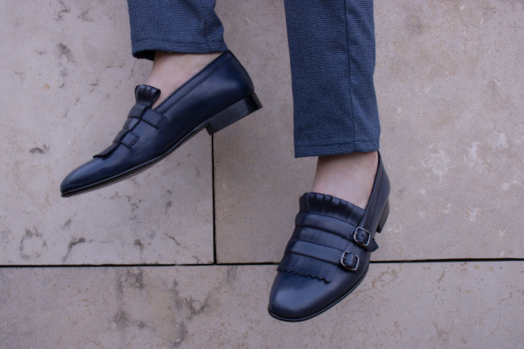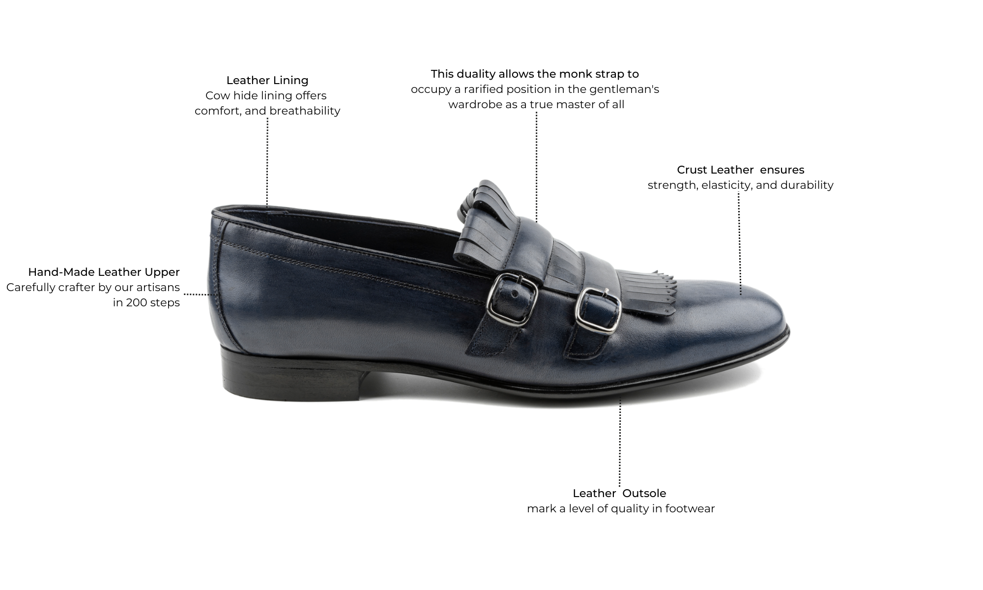 Huy Double Monk Strap Shoes, represent a transition towards the sleek, low, and slip-on design of leather loafers, while boldly retaining their Monk Shoe characteristics with double buckle and fringe embellishments. Crafted with first-class crust leather, 'Huy,' thanks to the neutral character of navy blue, can be paired with denims, chinos, and a variety of shirt and polo colors and patterns.
