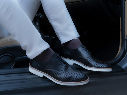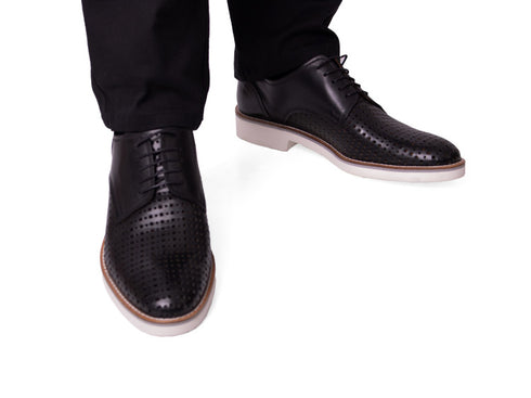 Isa Summer Derby Shoes, Top Grain Perforated and Plain Leather Dress Up Sneakers, All Black Dress Sneakers, Sneaker Bottom Dress Shoes