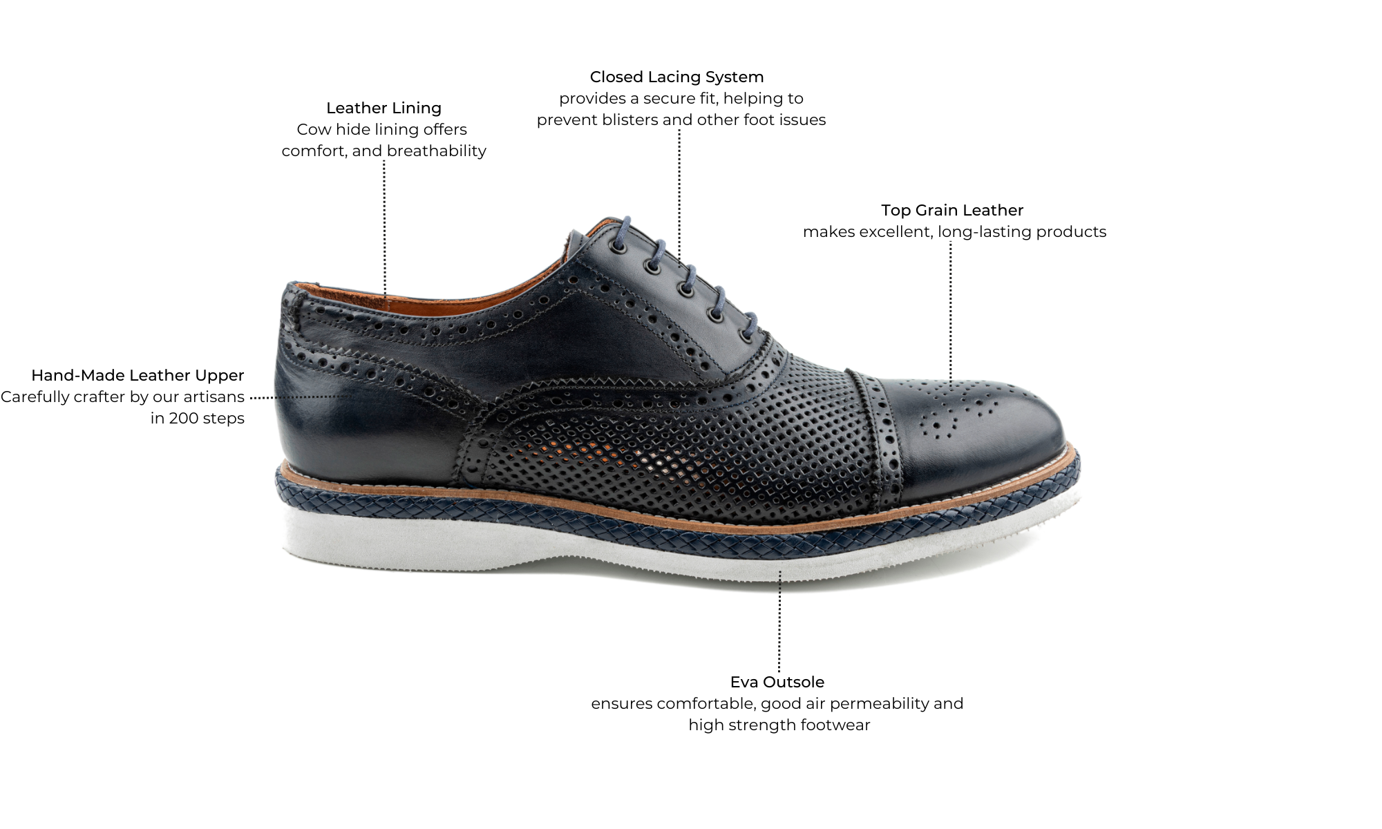 Our Oto fuses traditional Oxford style with sneaker comfort, thanks to EVA soles. Features include a semi-brogue design, cap toe, perforations for ventilation, and a decorative braided leather strip. Lined with premium cowhide leather for breathability and comfort. Available in brown and navy. Pair brown with beige chinos or khaki trousers for a relaxed look; pair navy with grey or black trousers and button-ups for a bolder statement. Complete your look with a classic watch.