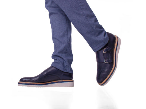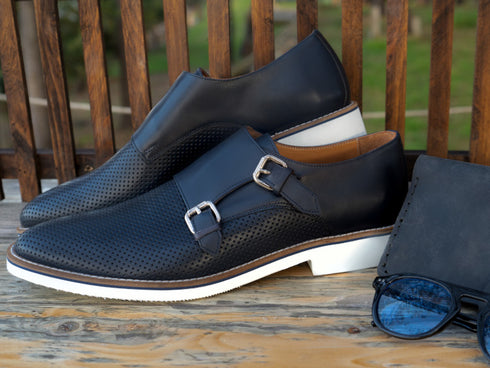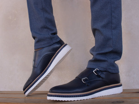 Double Monk Strap Dress Sneakers with Perforated Design in Navy