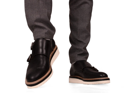Nuh is not your usual monk strap dress shoe. Generously perforated vamp, elevated sole with EVA, and the thin and delicate woven ribbon around it make it a complete summer double monk strap dress sneaker. An important piece of our Hybrid Leather Dress Shoes collection, Nuh stands out with its lightweight, versatile design, and buckle details. It is suitable for your walks in the chaos of the urban jungle, as well as a road among the trees or a seaside. Pair the Nuh double monk strap dress sneakers with light beige linen trousers and a white short-sleeved button-down shirt.