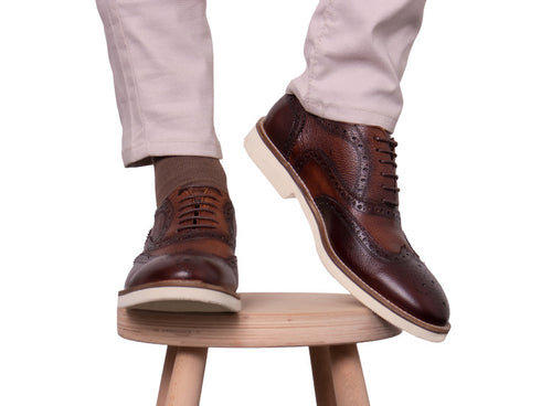 We invite you to take a closer look at Tai. Yes, it is a full-grain leather Wingtip Oxford, but upon closer inspection, you will notice the impeccable craftsmanship, the stunning color choices in various tones, and the different leather patterns on the toe and other upper regions. Additionally, it has been modernized with an EVA sole, offering unparalleled comfort. An alternative amount thousand others: Pair with tailored trousers, ana a thin-ribbed turtleneck, and experience the beauty