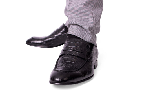 Mokassin-Zehe, Krokomuster, Penny-Loafer aus schwarzem Leder für Herren