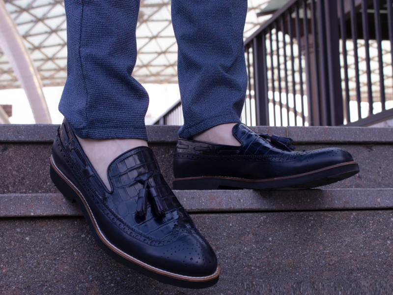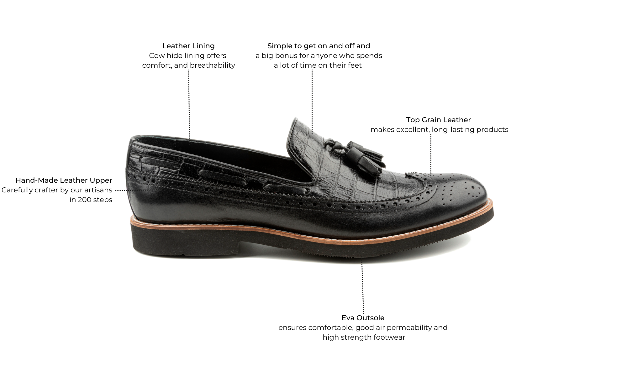 Los zapatos de vestir tipo mocasín ya transmiten una clara confianza informal. Combinado con un diseño brogue completo, de alas largas y una parte superior con patrón de cocodrilo que es la guinda del pastel, el producto final es una obra de arte llamada "Kea". La comodidad genérica de los mocasines sin cordones se ha logrado con la suela de EVA una comodidad similar a la de una zapatilla deportiva. Viene en la versatilidad del negro y la tranquilidad del azul marino.