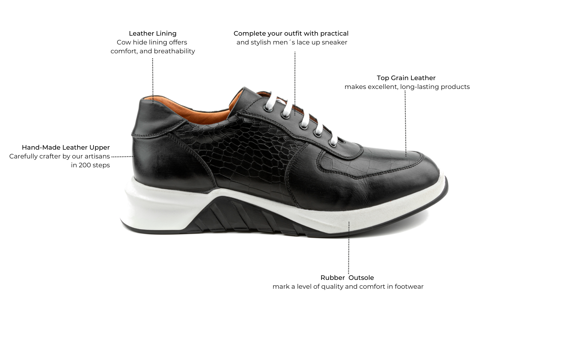 Upper Leather: | Cuero curtido con anilina de grano superior y grabado en relieve |