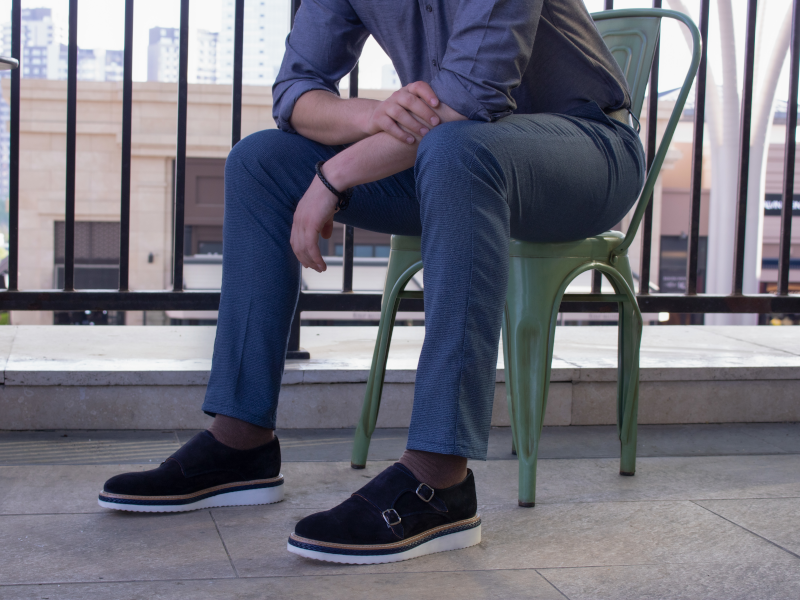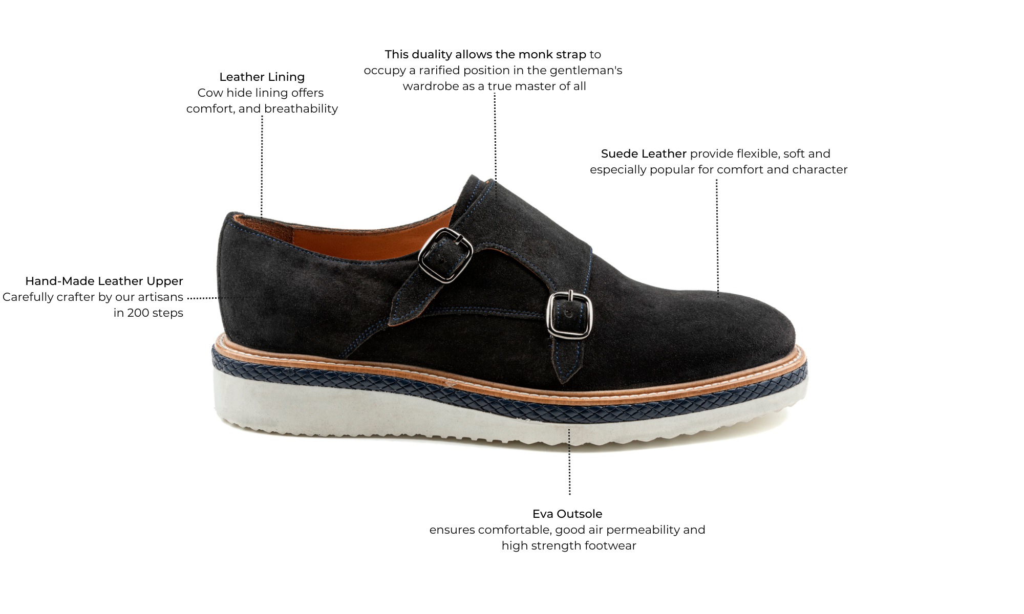 El Nas, otra niña de nuestros ojos de nuestra colección de zapatos de vestir Hybrid Sneaker, es un diseño hermano de nuestro modelo Nuh. Sin embargo, Nas destaca como un zapato monje, llevado de la imaginación a la realidad con piel serraje. Este material proporciona de forma inherente ligereza y transpirabilidad, eliminando la necesidad de perforaciones. Nas también presenta una suela elevada con EVA, una fina y delicada cinta tejida a su alrededor, y lleva la estética distintiva de los zapatos de gamuza con hebilla. Combina el Nas Double Monk con un par de pantalones blancos de lino de pierna recta y una camisa a rayas, de manga corta y con botones en tonos tierra.
