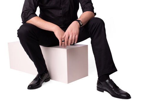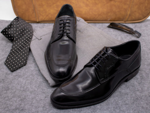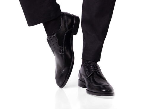Oro Series Black Leather Derby Shoes merge elegance and functionality. Detailed with a stylish moc toe and gimped edges on the facing, these lace-up shoes offer versatility and a secure, comfortable fit. Perfect for long workdays or special occasions. Dress to impress with Oro.