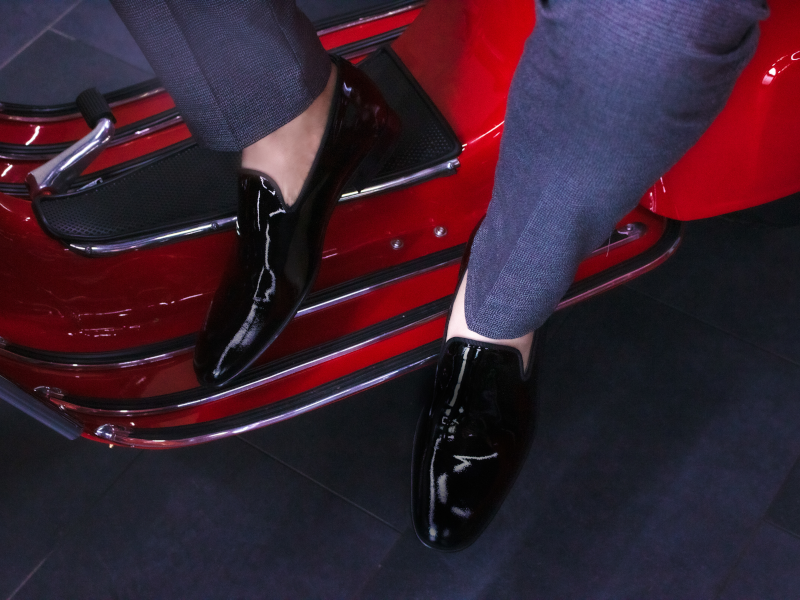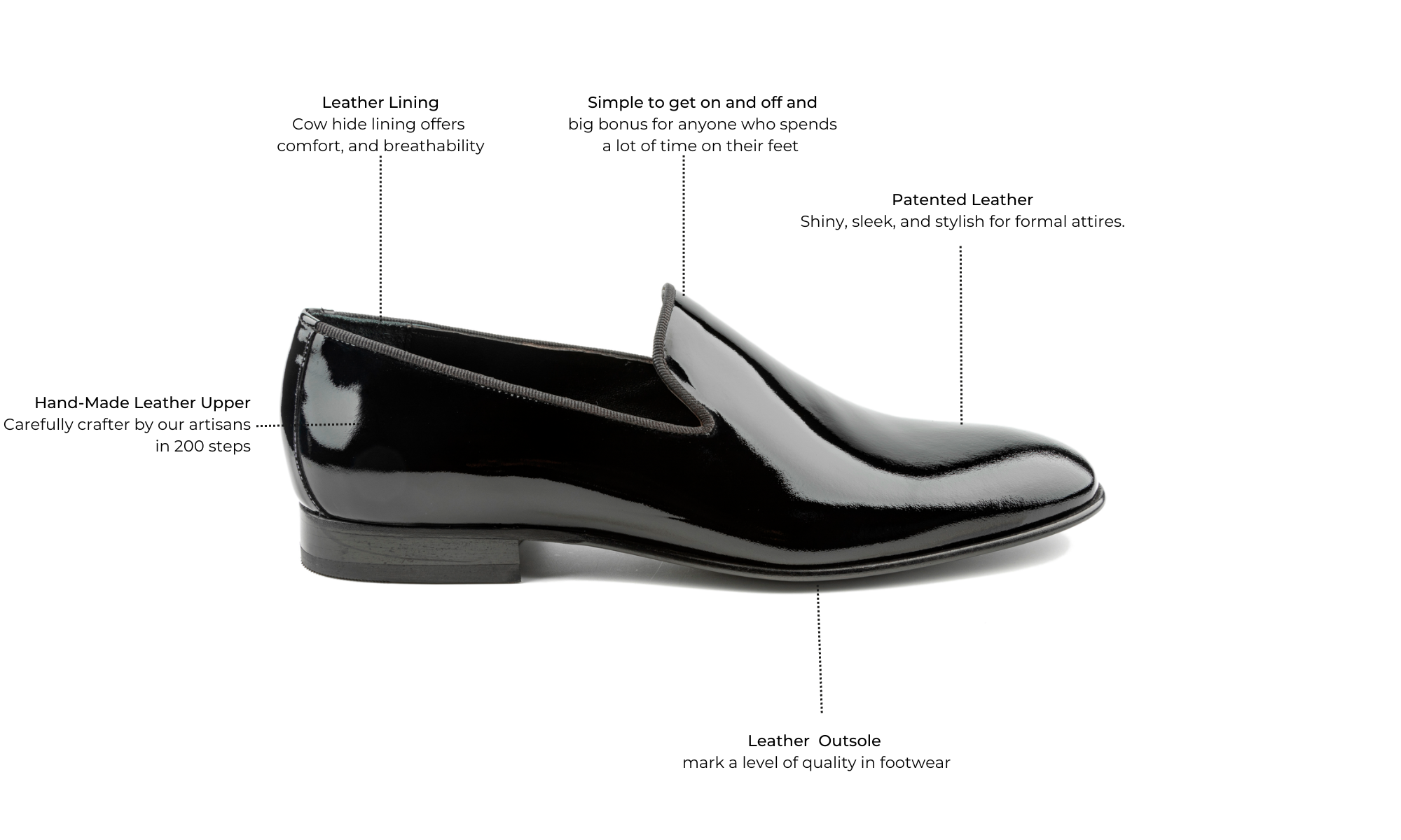 A pristine men's evening shoe, made entirely from 100% patent leather. This special shoe is designed for exclusive events like parties, galas, balls, ceremonies, weddings, and other sophisticated black-tie occasions . The signature slip-on loafer stands out with its flawless lines and unmatched craftsmanship. The rare combination of slip-on loafer comfort with such a stylish, sleek, and elegant design is truly exceptional. You'll absolutely adore our Ibo and receive numerous compliments.