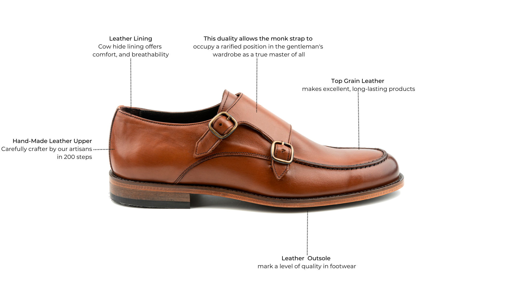 Moc toe design in men's dress shoes, as showcased in our Aba Series, aligns with the broader Americana trend in fashion, celebrating the perfect convergence of tradition and style. The Aba design double monk strap shoes are particularly notable for their supremely smooth and supple top grain leather texture, with a striking gradient transition, especially noticeable in the burnished shade on the toe. This blend of Monk and Moc Toe offers an excellent choice for transitional moments. Pair it with earthy tones like beige, gray, or brown chinos, or opt for a more dressy pants variant, and step out with confidence.